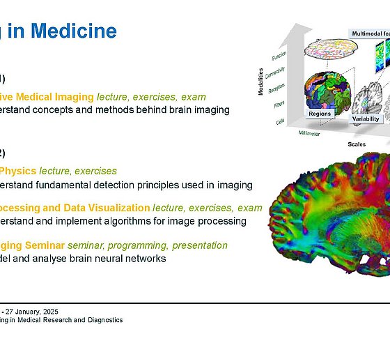 The first part the lectures will cover the basics of imaging in medicine and biology, particularly Tomographic Imaging. There will be a focus on imaging with Ionising Radiation X-ray, CT, SPECT, PET. The related physics basics will be introduced and their relevance for imaging will be discussed. Computer-based simulation will be introduced to compare different physical phenomena. The lectures will present the concept and physical background of various devices applied during imaging starting from the data acquisition till the reconstruction of tomographic images. The complete processing pipeline will be presented and explained in detail. In the second part of this course the basics of image processing in general and image analysis of medical images in particular will be presented in all details. The application of image analysis in medicine and biology, starting from the basic description and basic operations on images extending to image registration and image fusion, will be demonstrated.