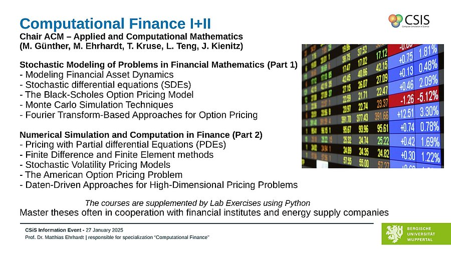 Modeling and numerical simulation of problems in financial mathematics using stochastic and partial differential equations, Monte Carlo simulations, transformation techniques, semi-analytic Fourier methods, stochastic correlation approaches, symplectic integration methods in finance. Master theses are in general in cooperation with financial institutes and companies for energy supply. The University of Wuppertal was the coordinator of the European Marie Curie International Training Network „STRIKE - Novel Methods in Computational Finance“ (2013-2016) and of the projects “Advanced structural properties preserving numerical integration schemes for stochastic differential equations with applications in finance” (financed by ABN AMRO London).